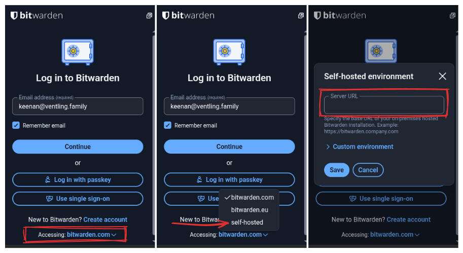 Change from bitwarden.com to self-hosted, then paste in the server URL: Copy Server URL